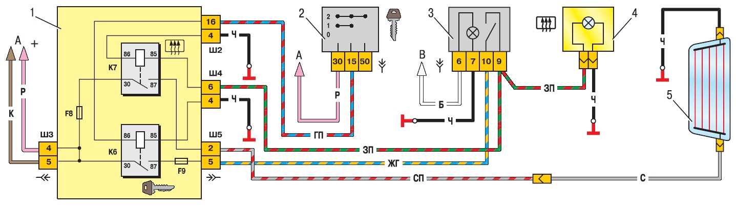 Монтажный блок (1), выключатель зажигания (2), выключатель подогрева заднего стекла (3), контрольная лампочка, сигнализирующая о включении ОЗС (4), нагревательный элемент ОЗС (5).
