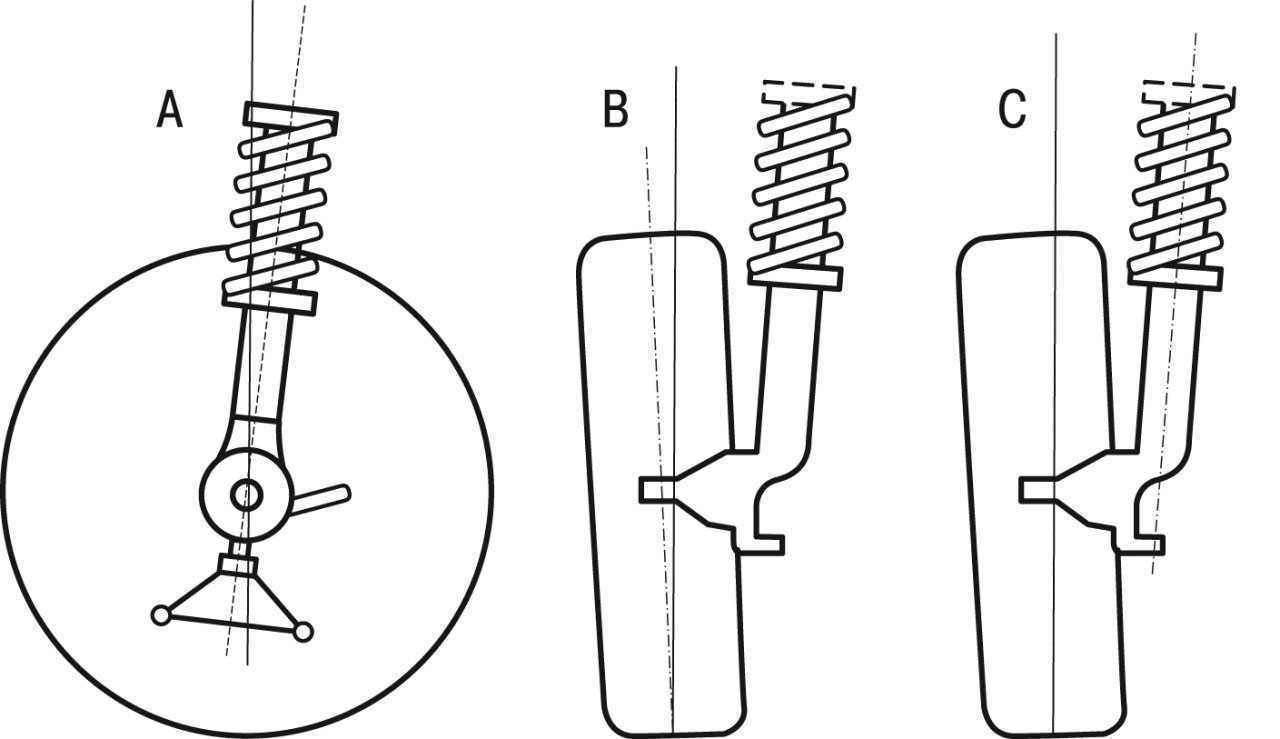 Очень важный и ответственный угол, нарушение параметров которого приводит к уводу автомобиля от прямолинейного движения, по сути, происходит смешение передней оси колес автомобиля по отношению к задней оси. Кастер стабилизирует управляемость автомобиля на высоких скоростях и обеспечивает при поворотах возвращение управляемых колес в исходное положение. Угол всегда имеет положительное значение, и чем он выше, тем устойчивее автомобиль на высокой скорости. На обычных автомобилях диапазон составляет от двух до пяти, а на спорткарах наклон достигает девяти и более градусов.