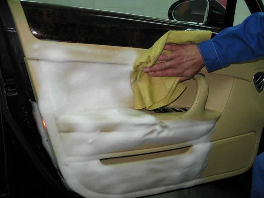 Следующая стадия – это сидения, их можно предварительно замочить в пенном растворе или залить спреем. Если имеются особо сильные загрязнения, то можно пройтись щеткой. Тоже самое можно проделать и с ковролином. Кресла из кожи и кожзама считаются более деликатными, поэтому к их очистке стоит подойти с особой внимательностью. Щетки придется отложить в сторону и воспользоваться тряпкой или губкой вместе с хозяйственным мылом.