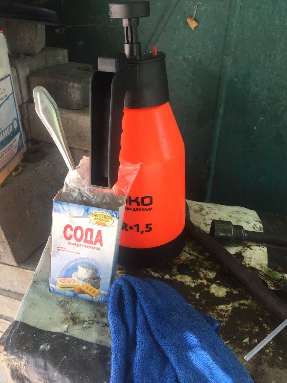 В бутылку второго пульверизатора засыпает пищевая сода и вода. Все взбалтываете до растворения.