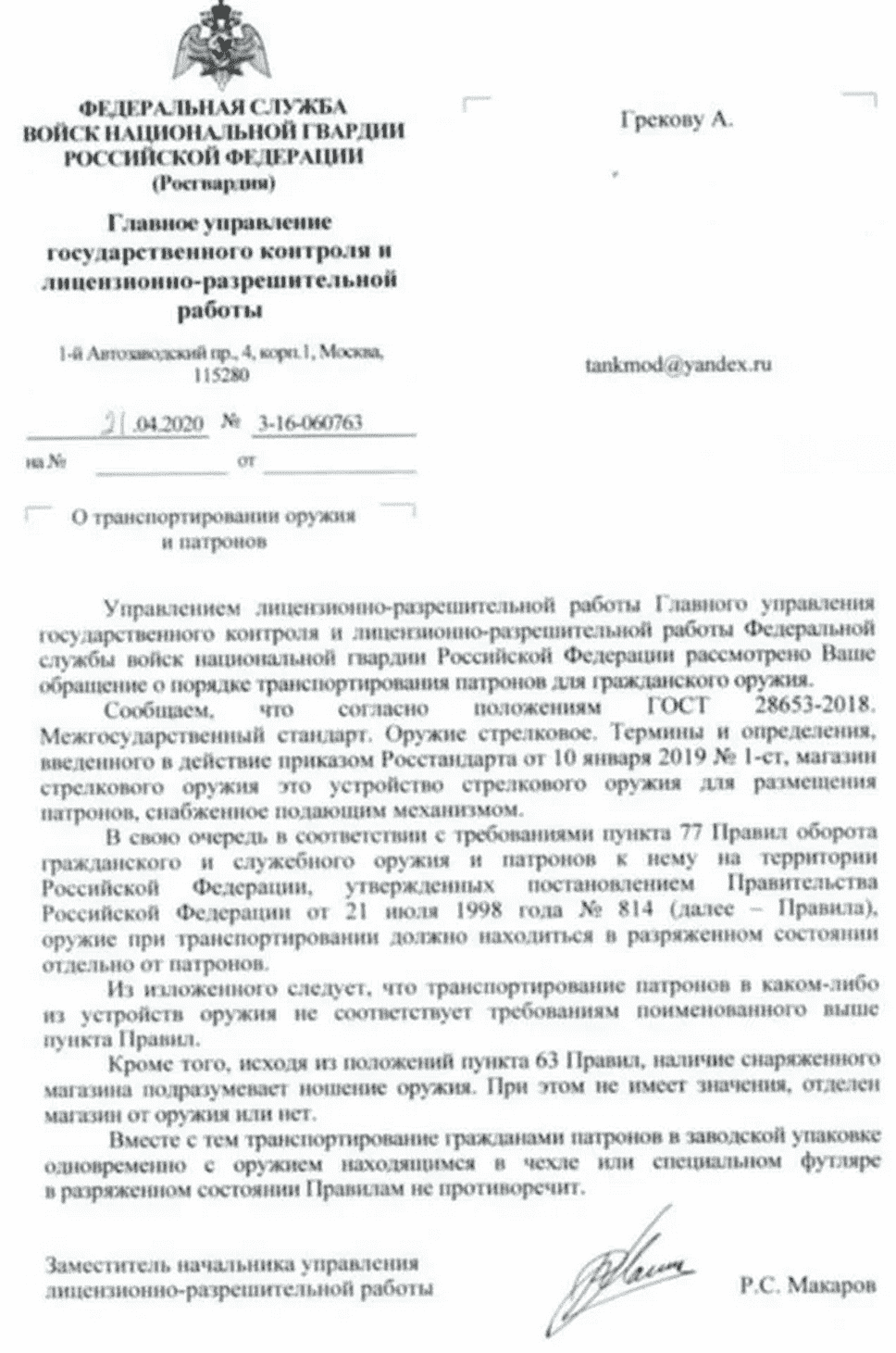 Но всё равно, с точки зрения приоритета и ФЗ «Об Оружии», и Постановление Правительства РФ стоят выше, чем разъяснения официальных лиц Росгвардии. Более того, в 2023 году такое письмо вообще не является нормативно-правовым актом и не имеет юридической силы.