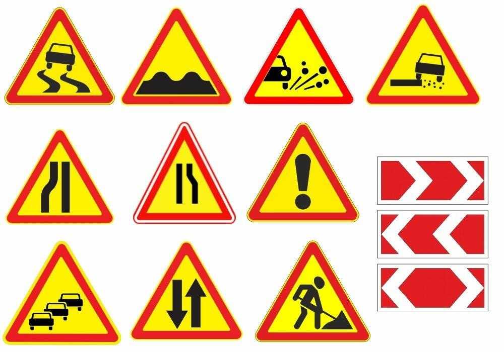 Первым делом посмотрим на то, какие из устанавливаемых предупреждающих знаков являются временными. Это те, которые выполнены на жёлтом фоне, а также предупреждают о: