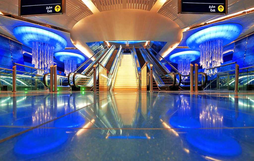 Метрополитен Дубая славится своей роскошью и шиком — попадая внутрь него, ощущаешь себя королевской персоной в собственном дворце — большие площади, фонтаны, золотистая отделка металла — всё это прекрасно передает атмосферу великолепия и изысканности одной из богатейших стран мира.