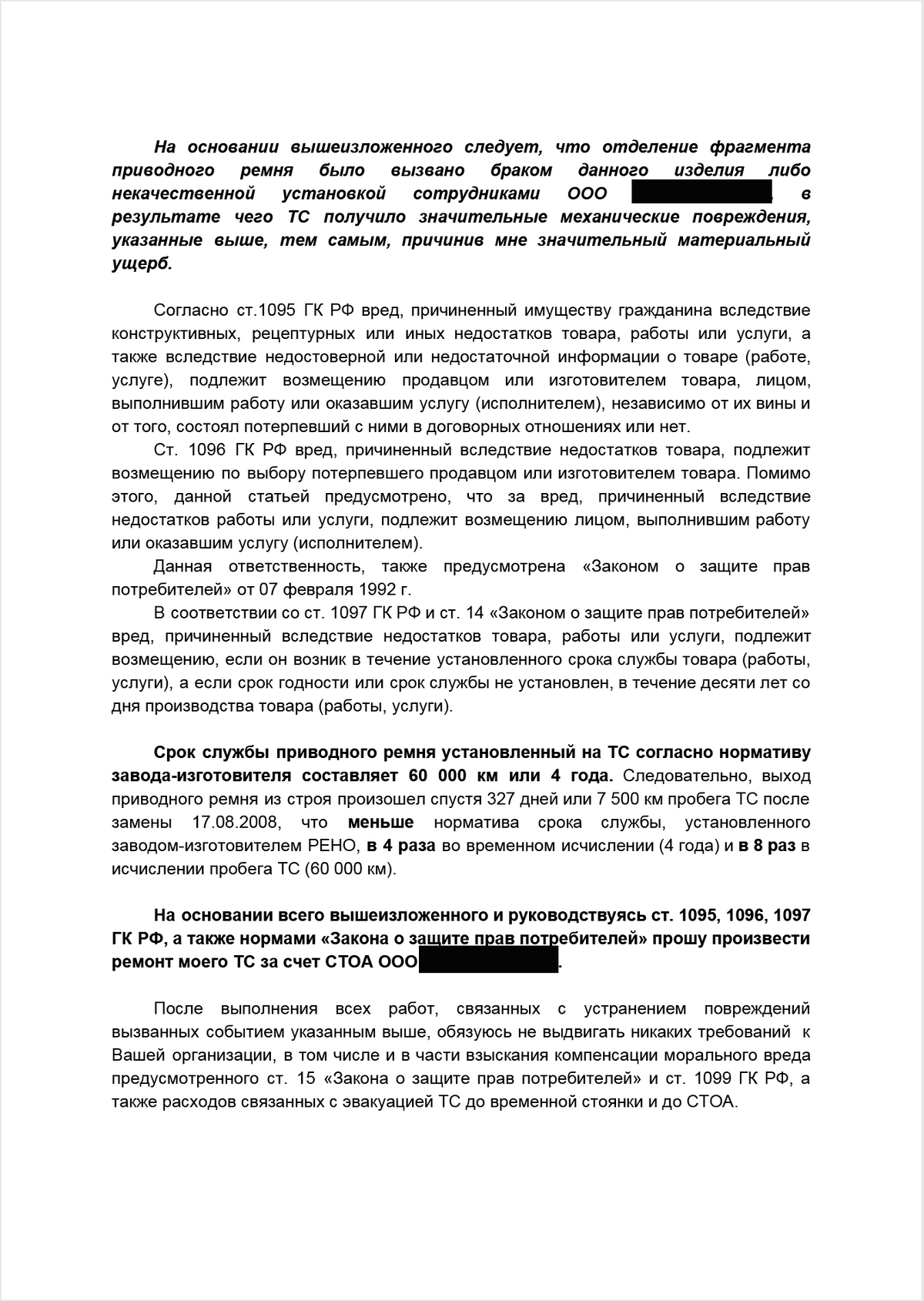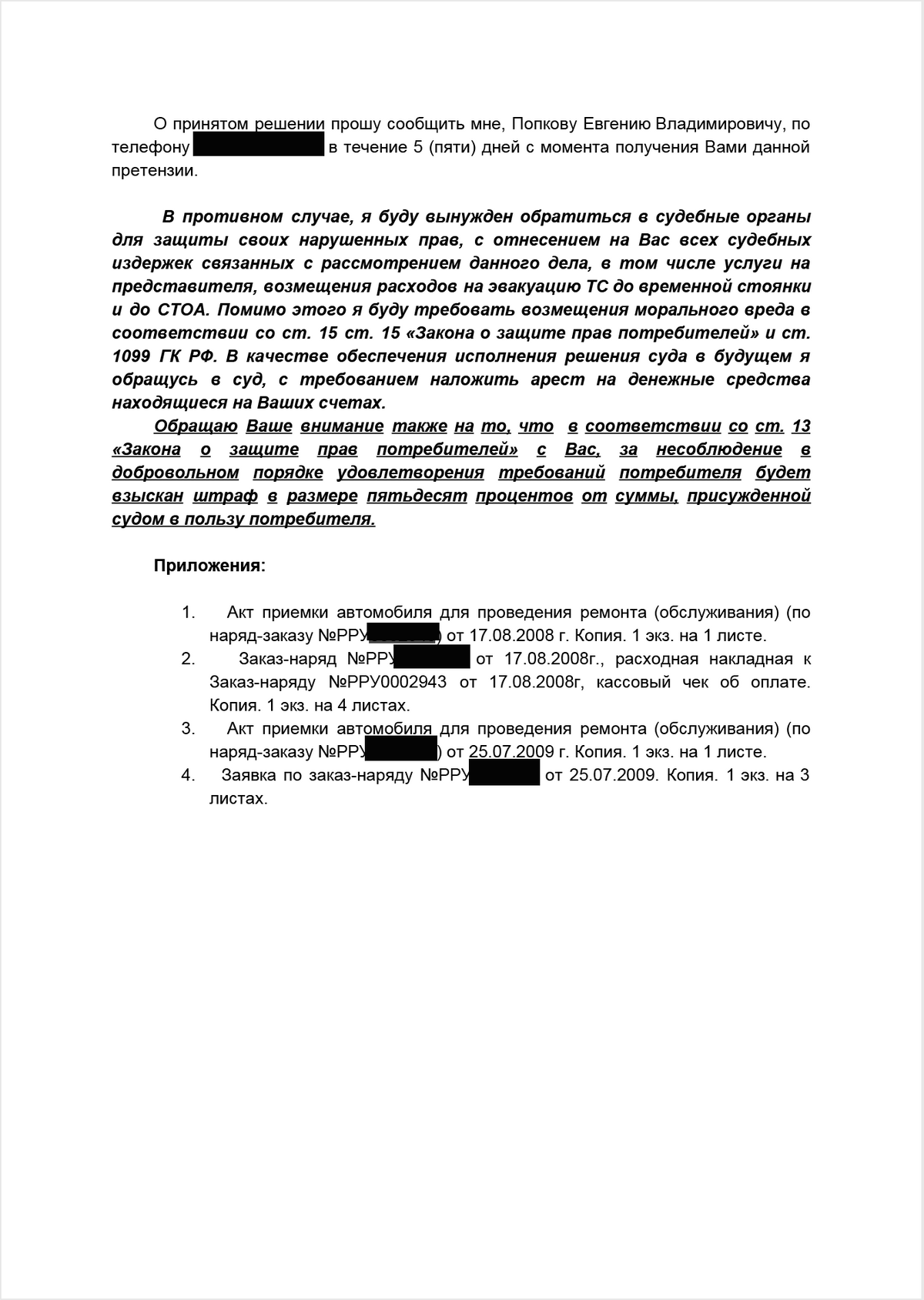 Для соблюдения формальностей гражданского делопроизводства я передал руководству автосервиса досудебную претензию. В ней я подробно описал всю хронологию событий и основания для компенсации своих затрат: