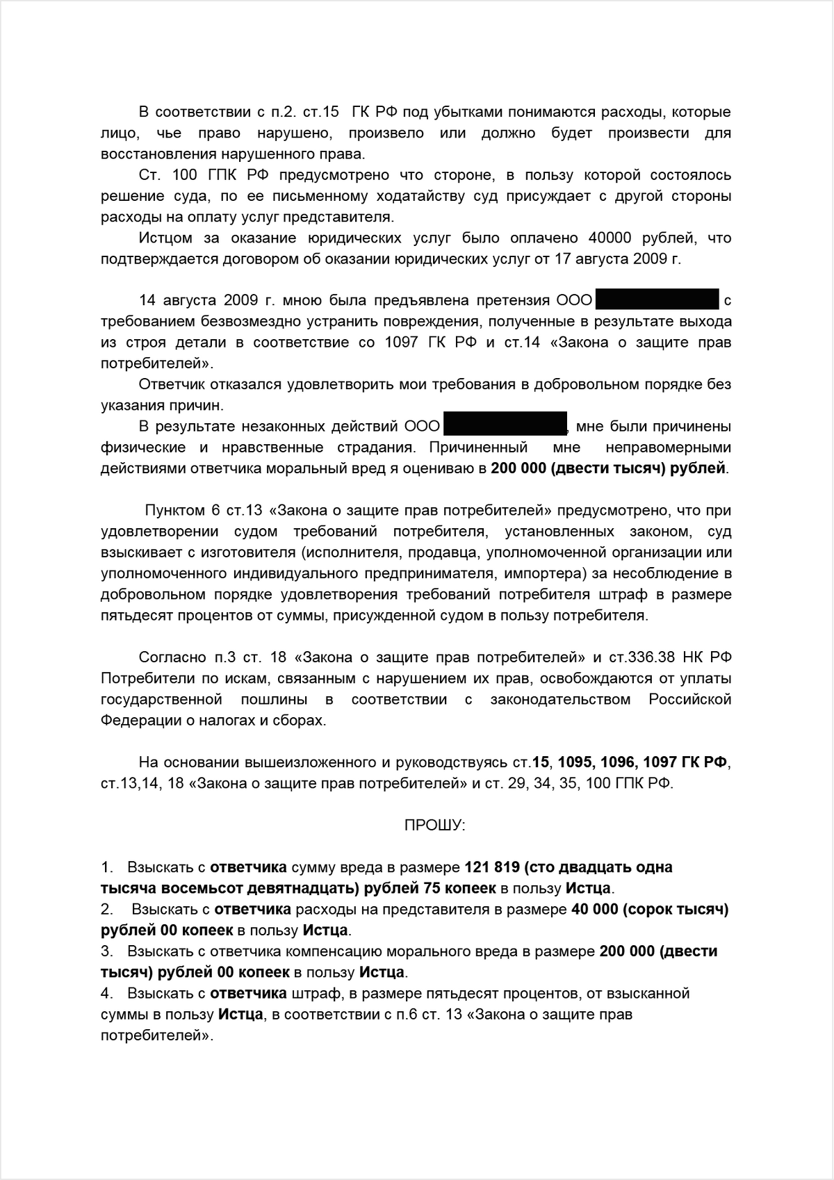 Сумму компенсации за моральный вред я указал с запасом, так как законом не регламентируется размер такого вреда. Как объяснил адвокат, российский суд в большинстве случаев значительно снижает размер «моралки» и здесь работает правило: чем больше напишешь, тем больше получишь.