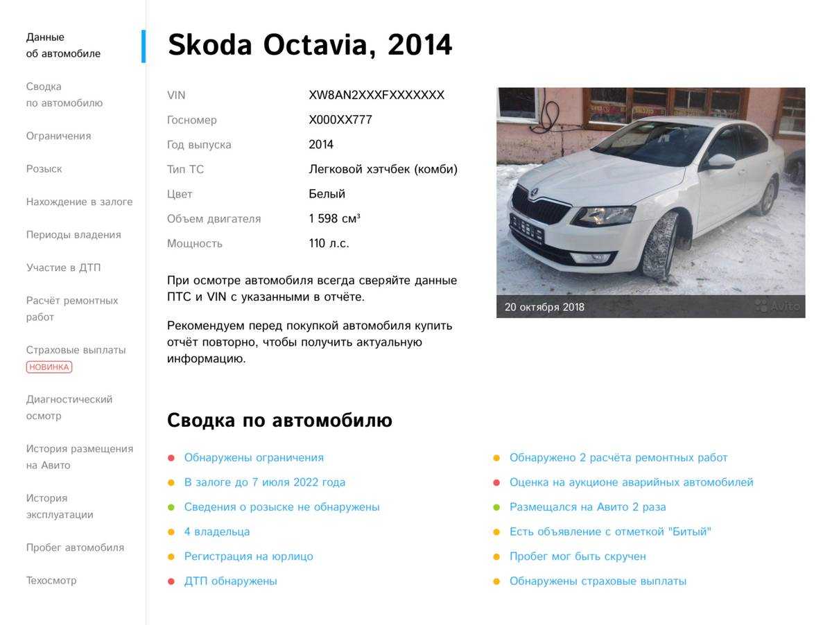 Сервис «Автотека». Сервис предлагает купить отчет по всем имеющимся сведениям об истории автомобиля. На апрель 2021 года отчет стоит 129 Р. Программа собирает данные из государственных баз и с коммерческих организаций: СТО, страховых компаний, банков и «Авито». Помимо официальной информации пользователь узнает, когда и как делали ТО, сколько раз ремонтировали машину и с каким пробегом она продавалась на «Авито» в прошлый раз. Чтобы проверить машину, потребуется только вин-код.