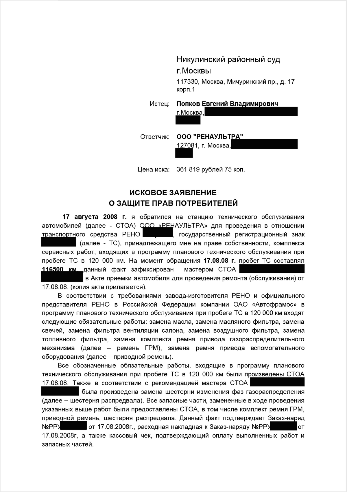 Исковое заявление я подал в Никулинский районный суд Москвы по месту своей прописки. Вариант подать в суд по месту нахождения ответчика я отверг сразу: был риск, что у автосервиса давно налажены дружеские отношения с этим судом.