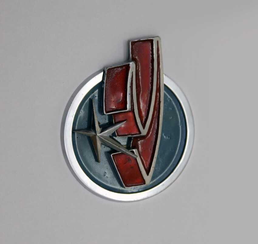 In 1957 – 1959 the brand was using three different badges for its cars. One was a light blue and silver circular badge in a thick frame and with two silver horizontal lines under the strict white wordmark.