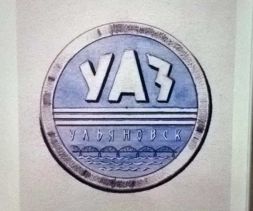 - С изображением моста через волгу и крупными буквами «УАЗ»