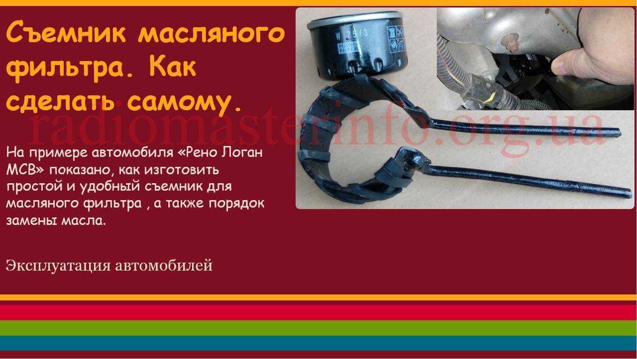 На примере автомобиля «Рено Логан» показано, как изготовить простой и удобный съемник для откручивания масляного фильтра в труднодоступном месте, а также порядок замены масла.