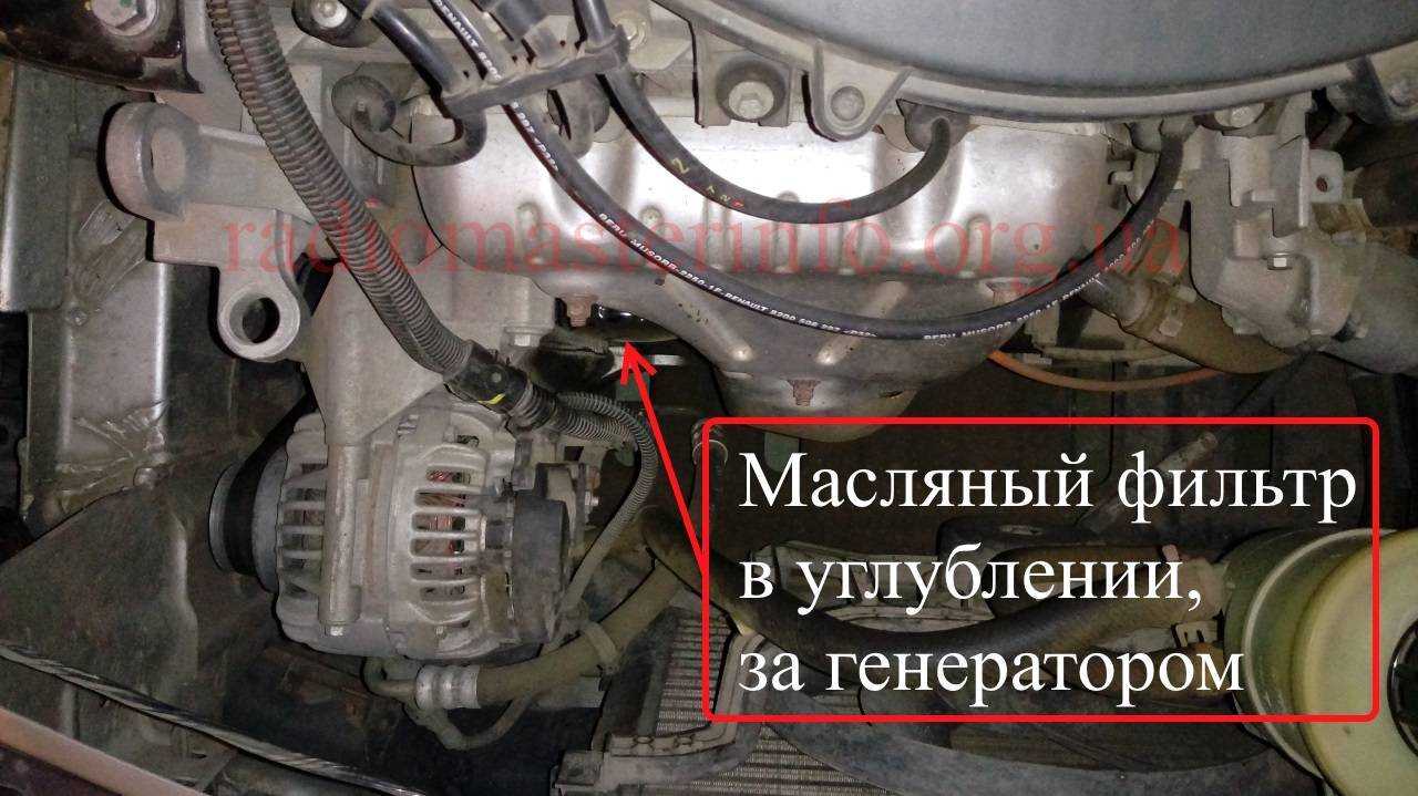 На автомобиле «Рено Логан» масляный фильтр находится на передней части двигателя в углублении, напротив которого расположен генератор.