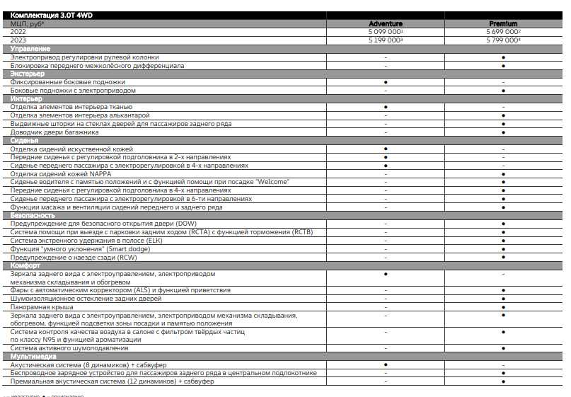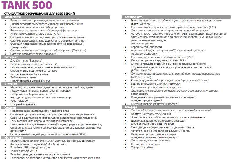 Но, пожалуй, главный фактор — это возможность выбора Ленд Крузера с 5 или 7 местной компоновкой салона. 7 местный Танк 500 тоже есть, но его продажи в РФ пока не планируются и это существенный минус Танку. Ниже на скринах можно сравнить комплектации Танка 500 и Ленд Крузер 200.