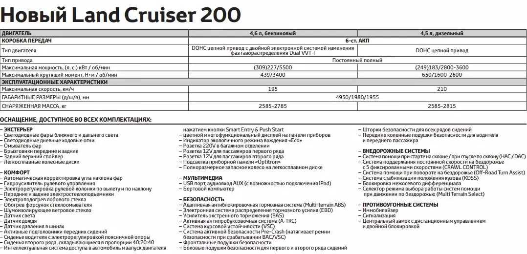 Для российских покупателей, предпочитающих бензиновые версии, предлагается проверенный и надежный 4,7-литровый V8 двигатель 1UR-FE с электронной системой изменения фаз газораспределения (VVT-i) – от 3 971 000 рублей. Мощность силовой установки составляет 288 л. с., а крутящий момент — 439 Нм при 3400 об/мин. Система впуска с переменной геометрией позволяет увеличить тягу на низких оборотах и приемистость на высоких. Разгон до 100 км/ч занимает 9,2 сек., максимальная скорость — 200 км/ч.