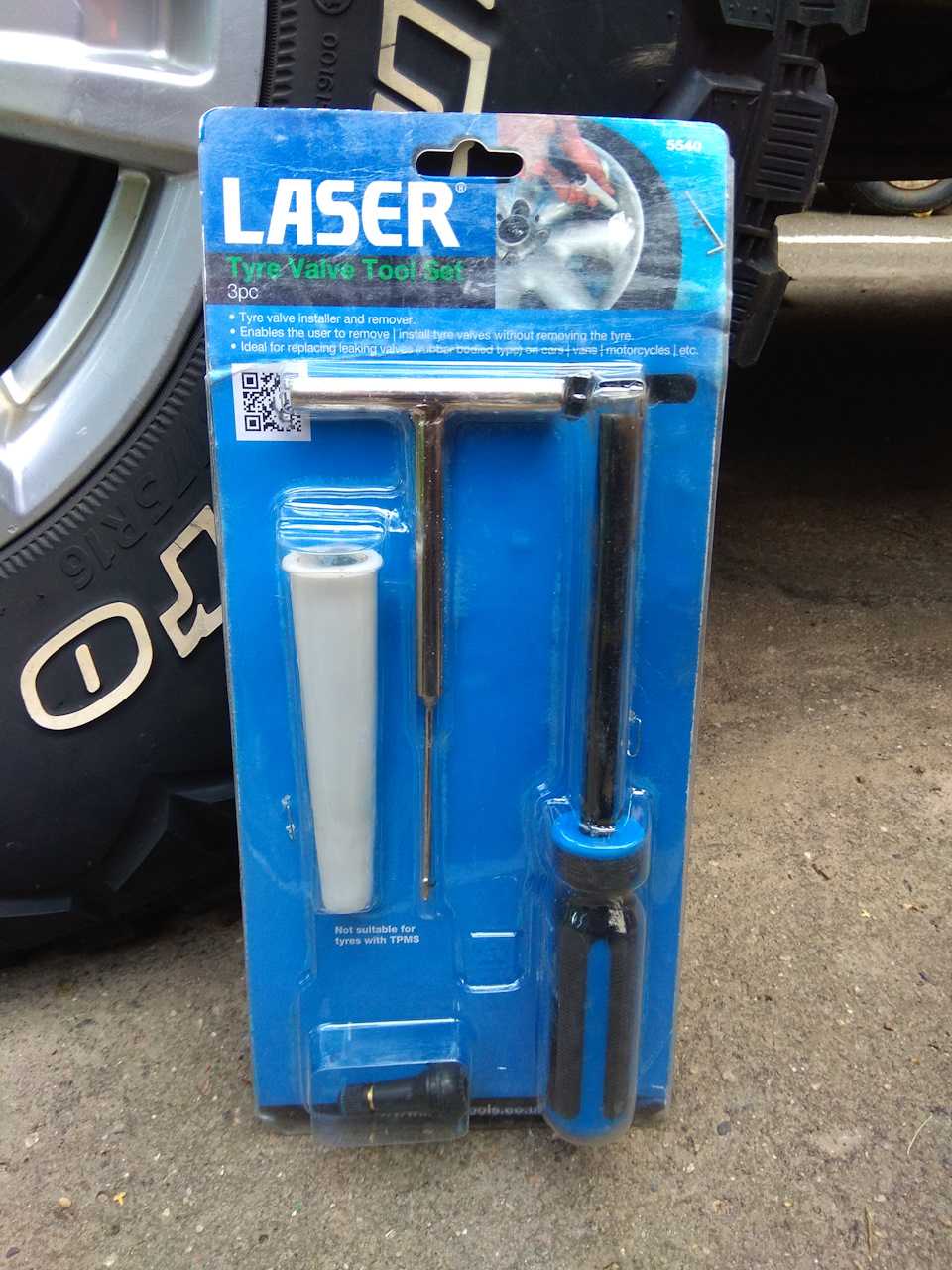 5540 Tyre valve toolset от некоей британской фирмы Laser. Заказывал на ебее прошлым летом. Набор состоит из трех приблуд: экстрактора старого вентиля, пропердоливателя монтажной отвертки и направлюящей воронки-аппликатора. Экстрактором извлекается старый вентиль, на отвертку накручивается новый, и через воронку, прижатую к отверстию в диске, новый вентиль запердоливается монтируется на диск.