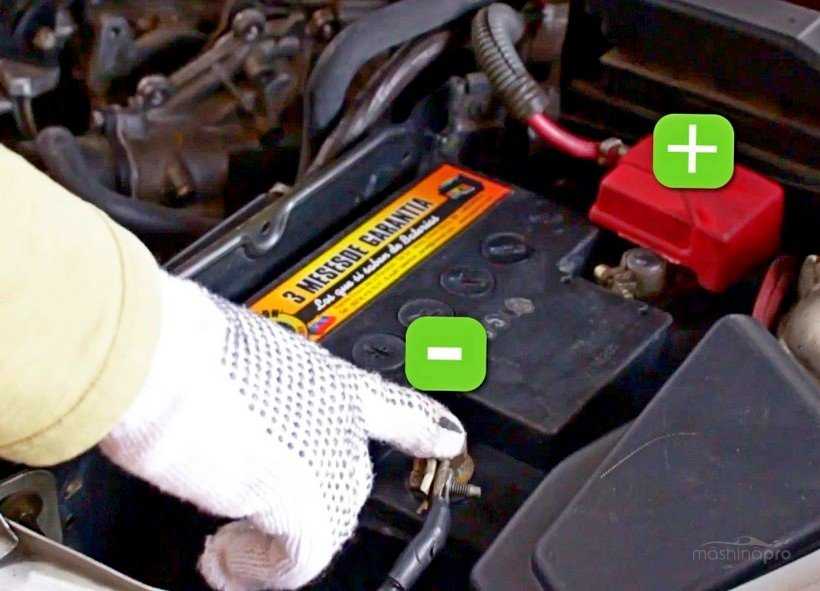 Запомните, в какой последовательности нужно снимать клеммы, которыми соединён аккумулятор. Сначала убирается минус, затем плюс. Если демонтаж самой АКБ не предусмотрен, чтобы обесточить машину, достаточно убрать только минус. Но для перестраховки многие отключают одновременно обе клеммы.