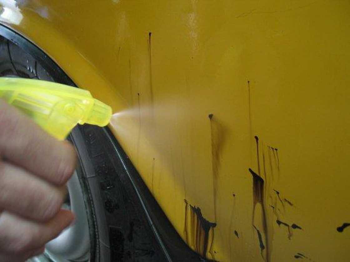 - Если пятна возникли недавно и образовались на холодном кузове, то лучше отчистить их сразу — самостоятельно. Нужно использовать специальный очиститель. Правила применения написаны на упаковке. Их нужно соблюдать.