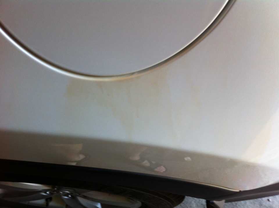 Если проблема снаружи, на внешних элементах обнаружить ее легче. На кузове остаются потеки и пятна. Если инцидент обнаружен сразу, то негативного эффекта можно практически избежать. Для этого необходимо при помощи ветоши или фибры убрать остатки пролитого вещества. Потом чистой салфеткой протереть место вокруг горловины. Также рекомендуется произвести мойку авто.