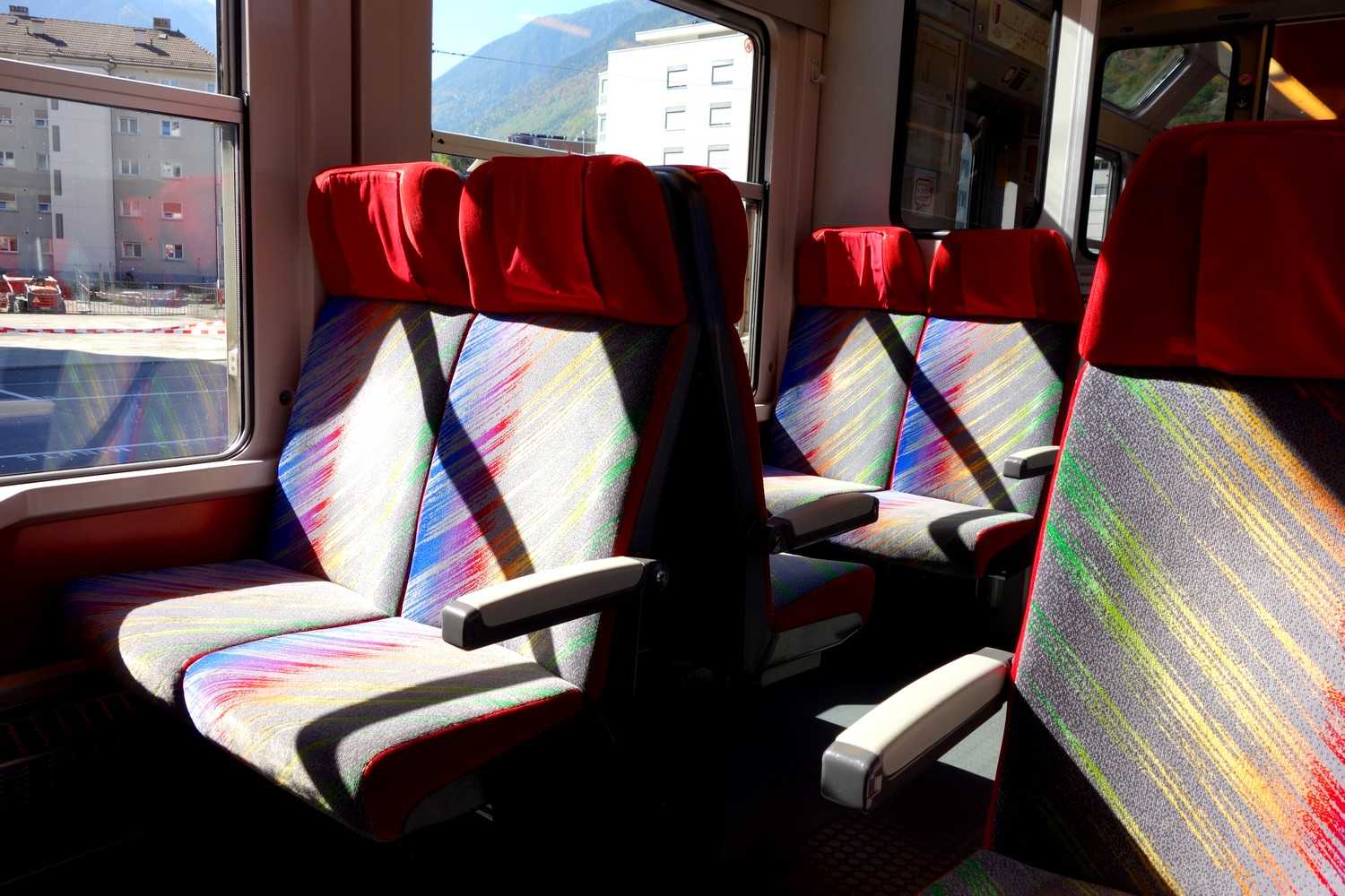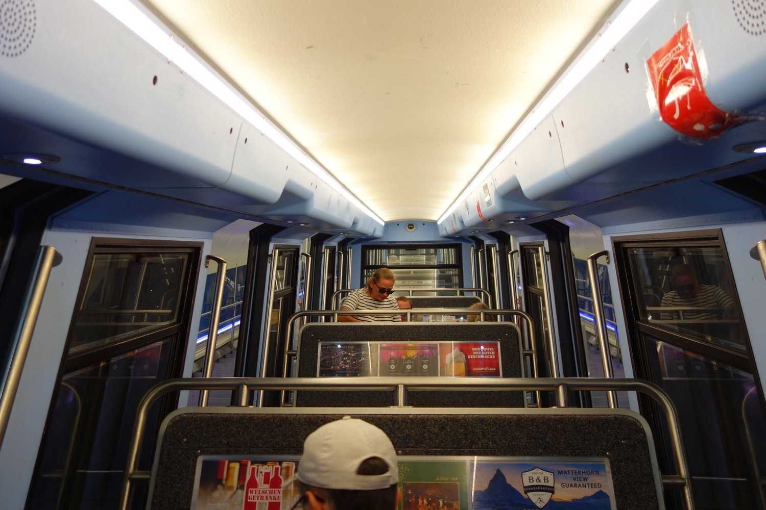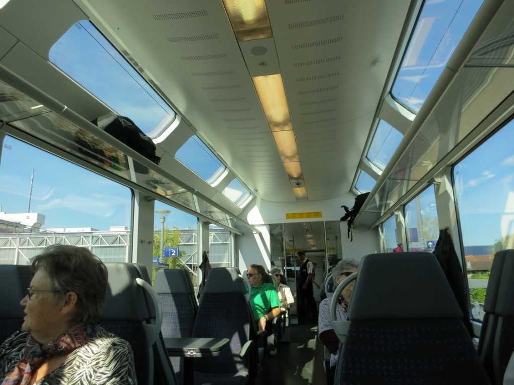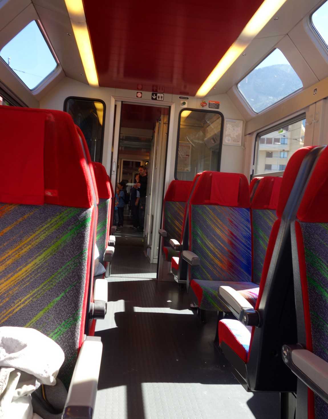Удобный и современный поезд в Швейцарии. Потолки в нём частично из стекла. Мягкий свет проникает со всех сторон, но не ослепляет, так как стёкла антибликовые, от этого отражение имеет красноватый ореол. Особенно красивыми казались облака в трёхмерном эффекте с перламутровым отражением.