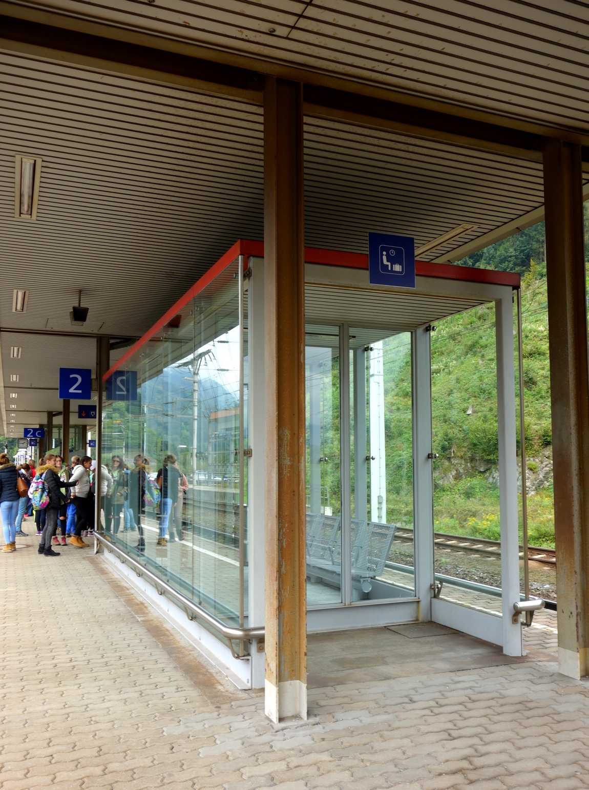Вокзал в Австрии и крытый павильон-остановка между путевыми линиями железной дороги, где можно укрыться от ветра и дождя пассажирам. Кроме этого для удобства есть лифты, с помощью которых можно удобно подняться на перрон из подземных проходов, а не тащиться с сумками через все пути и надземные переходы. Здесь заботятся о людях.