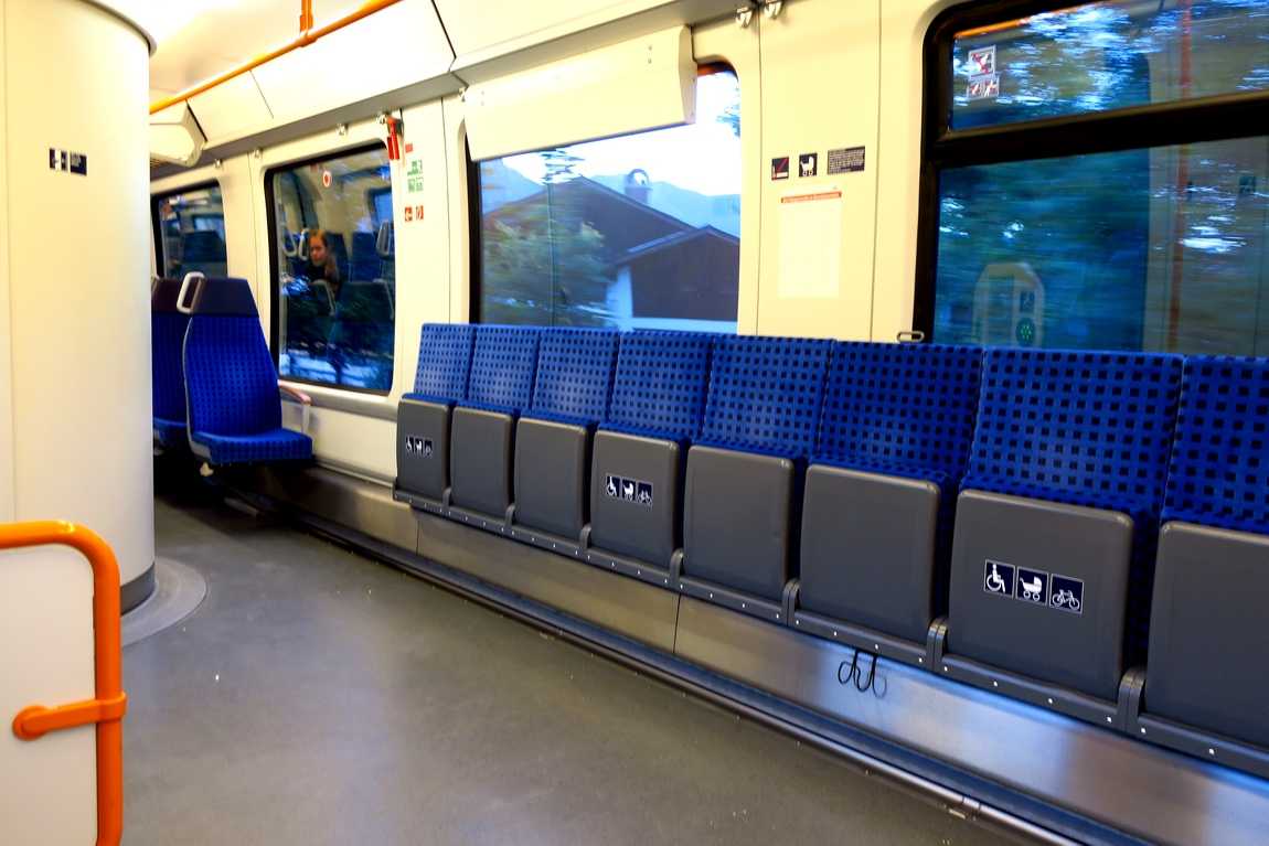 Внутри фуникулёр разделён на секции с сидениями напротив друг друга.