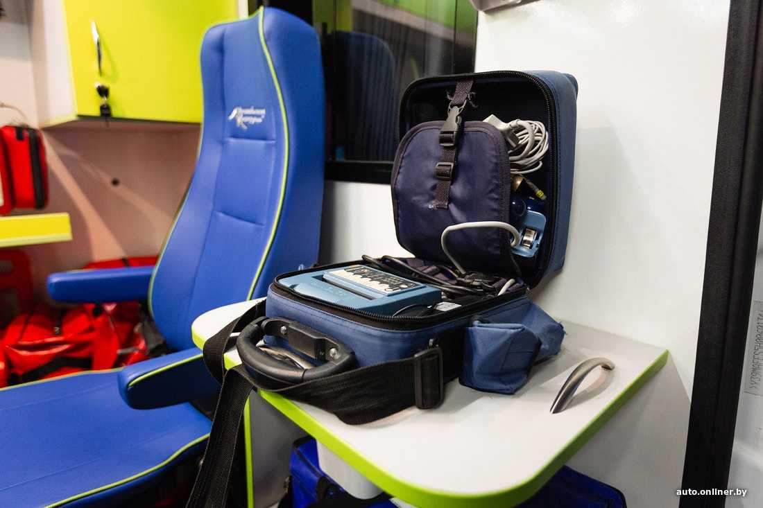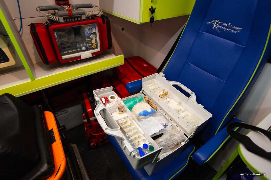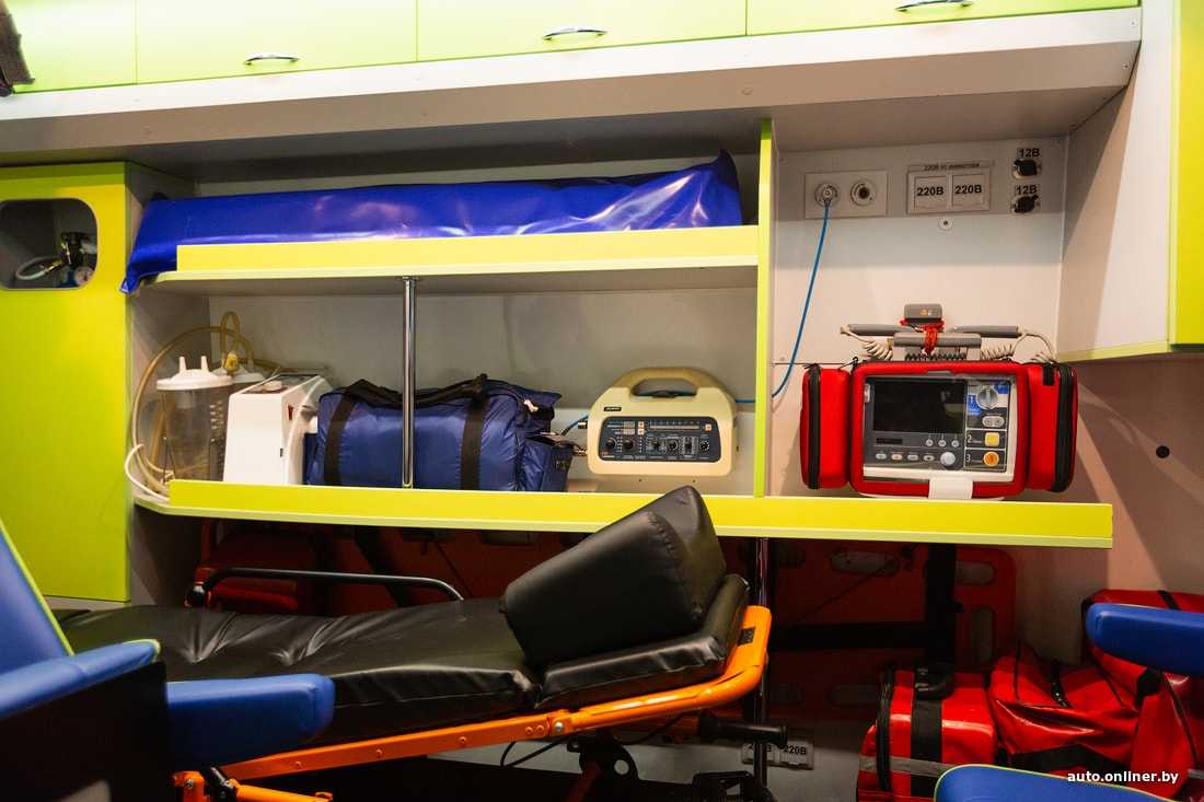 В машине обычно достаточно места для экстренной реанимации одного-двух пациентов. Борта автомобиля полностью заняты медикаментами и оборудованием — используется все свободное пространство. Также в кабине установлен реанимационный монитор, который показывает состояние больного. Есть аппарат искусственной вентиляции легких и наркозно-дыхательный аппарат, которые можно использоваться как в карете реанимации, так и автономно. Также в машине обязательно есть дефибриллятор-монитор. Его вы точно видели в кино. Ну, и, конечно, самые разные лекарства и инструменты. В том числе для экстренного принятия родов.