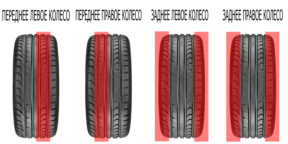 На заднеприводных автомобилях передние колеса изнашиваются в основном по бокам, а задние колеса изнашиваются посередине.