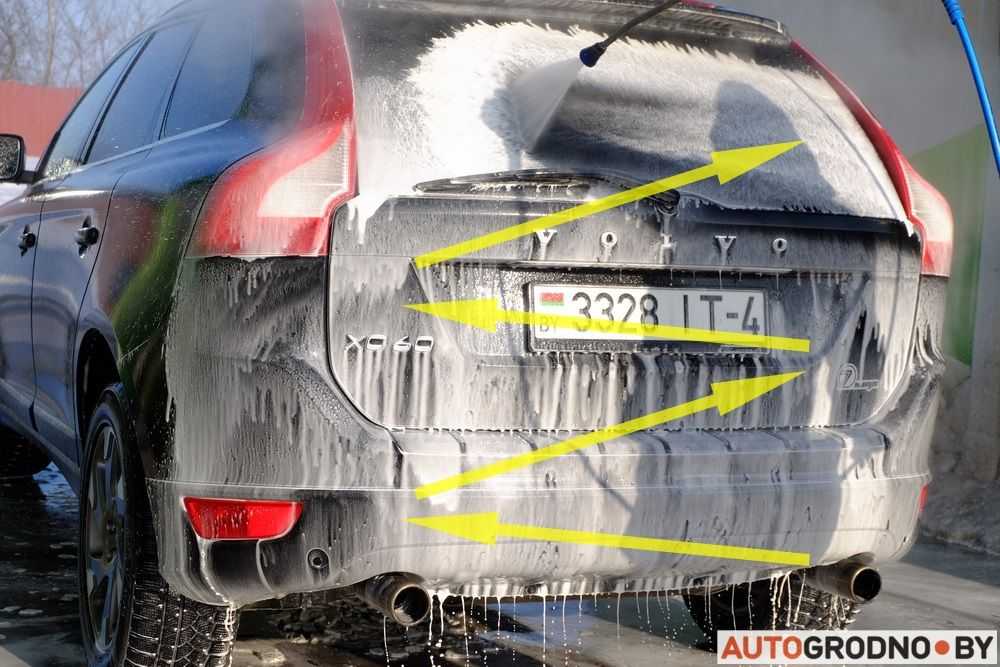Правильно – наносить моющее средство снизу вверх. Неправильно – начинать «пенную автовечеринку» с крыши и двигаться к низу. Объясняется это довольно просто: пена, нанесенная снизу, контактирует с грязью, которая разбухает и становится отличной преградой для шампуня, стекающего сверху.