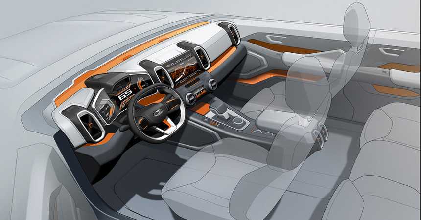 Двери в своем оформлении разделены на четыре секции: центральная горизонтально ориентированная обращена к приборной панели, на ней размещены музыкальные колонки, на задней в свою очередь расположены «парящие» складки подлокотников. Общее цветовое настроение в салоне поддерживается за счет сочетания оранжевой подсветки панели приборов и атмосферной подсветки такого же оттенка.