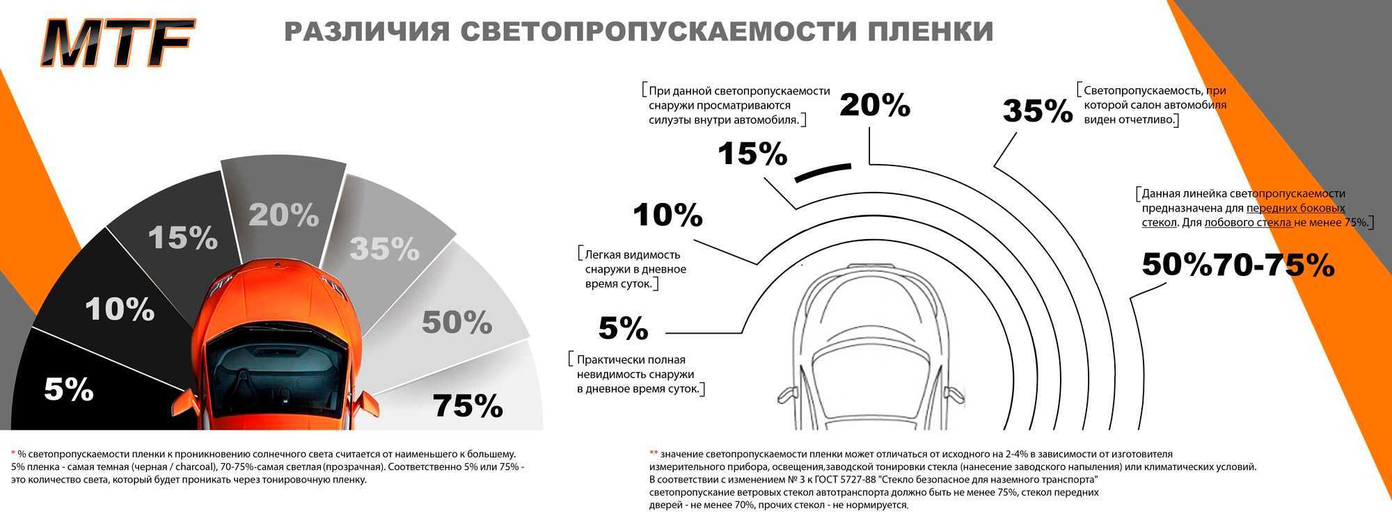 Светопропускная способность стекла – один из главных параметров при подборе светофильтра. Одно только наличие плёнки ещё не делает машину тонированной, поскольку автомобиль считается таковым, если уровень затемнения переваливает за отметку в 65%. При меньшем значении можно расценивать плёнку как декор.