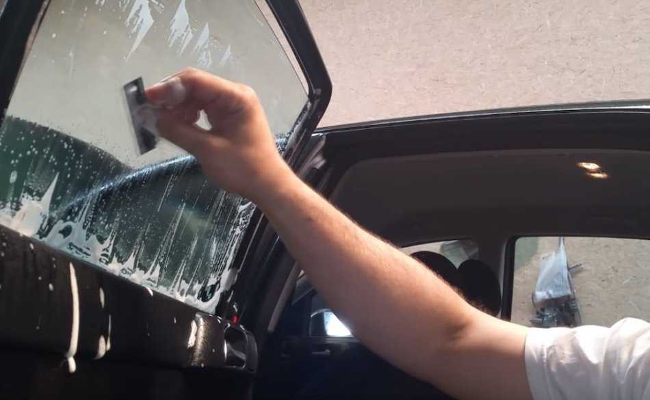 Удаляя лишнюю жидкость, нужно аккуратно заправлять тонировку в резинки с помощью тонкого скребка или пластиковой банковской карты. Пленка должна принять форму окна и расправиться.