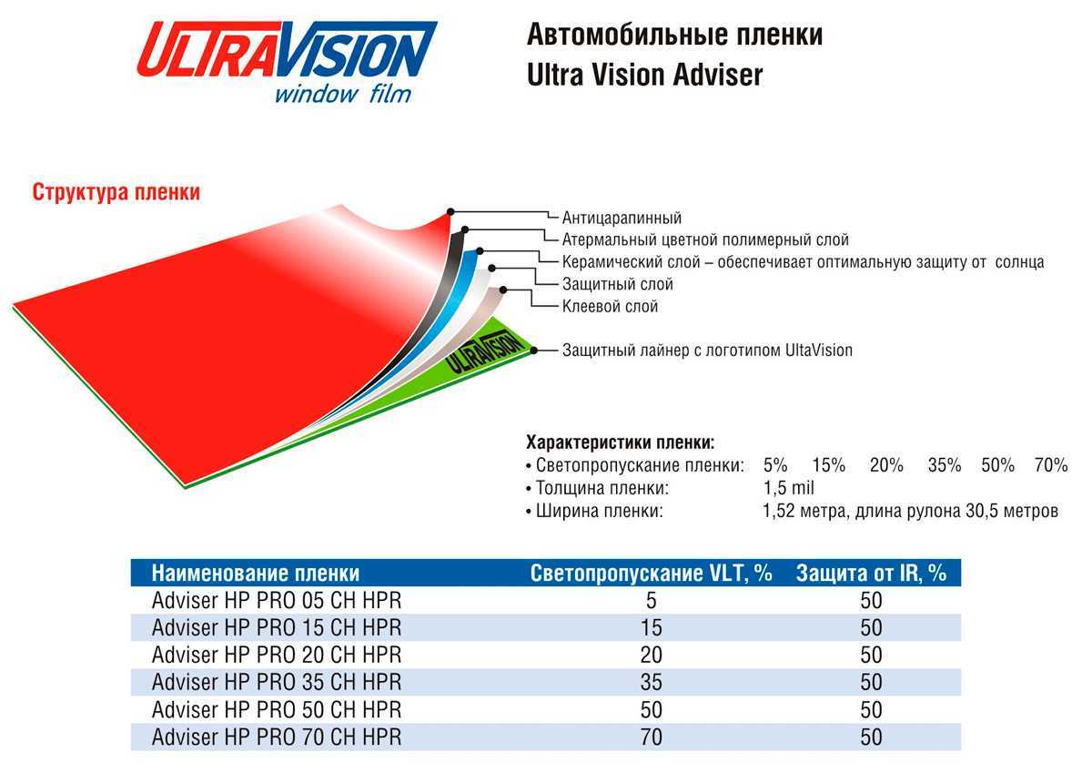UltraVision. Созданные из высококачественного материала, отличается лёгкостью и быстрой поклейкой, отсутствие зеркального блеска, не образуются заломы, стойкость к климатическим изменениям. Присутствует защита от солнечных лучей, обладает долговечностью.