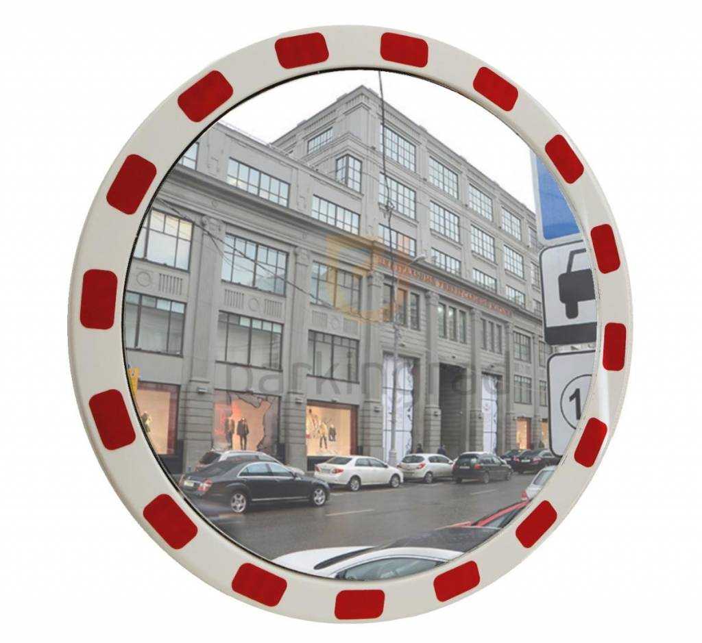 Зеркало обзорное для улицы эффективно применяется при просмотре закрытых зон при скорости движения до 50 км/ч. Световозвращающая (светоотражающая) красно-белая окантовка — отражает свет фар в тёмное время суток, для дополнительного привлечения внимания. Диаметр зеркала 900 мм (90 см)
