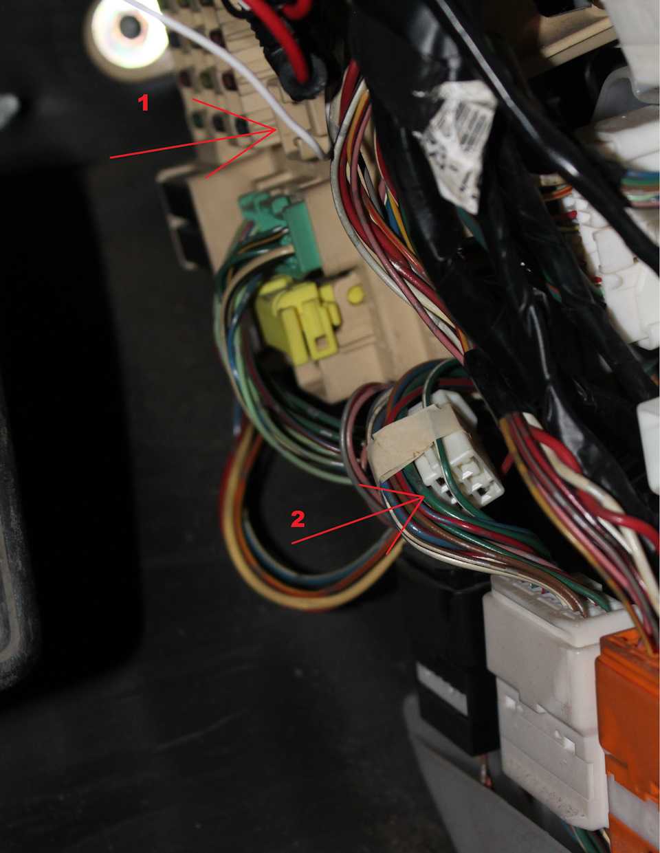 Начинаем с проводки, снимаем пластик под рулем, скидываем нижнюю панель с правой стороны в ногах водителя.Находим там свободную фишку и разъем, на фото стрелками отмечено должно быть все понятно, подключаем и закрепляем блок в удобном месте(фото закрепленного блока не получилось)так же на этом блок-реле есть два маленьких рычажка, это настройка секунд рабоы моторчика антенны в зависимости ее длины, я поставил минимум.