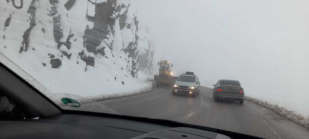 После перевала шел снег и водителю приходилось постоянно чистить лобовое стекло, чтобы видеть дорогу.