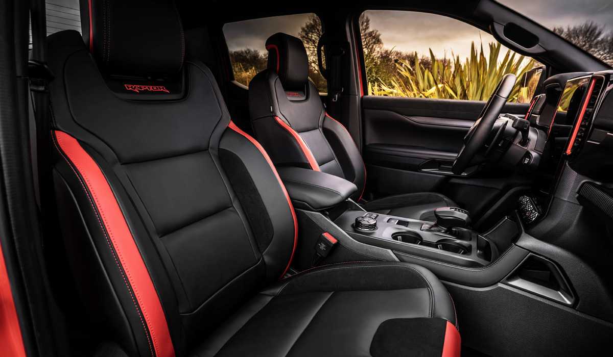 Экстремальный пикап также получает высокопрочную защиту картера двигателя в виде профильного 2,3-миллиметрового стального листа. Сам же кузов Ranger Raptor может иметь только двухрядное исполнение, а для салона приготовлено по-настоящему богатое оснащение. В него входят эргономичные передние кресла с намеком на спортивность, рулевое колесо с «отсечкой», специальная графика цифровых «приборов», большой 12-дюймовый планшет головного медиаустройства, аудиоподготовка Bang & Olufsen, комбинированная обивка (кожа/замша) и пр.