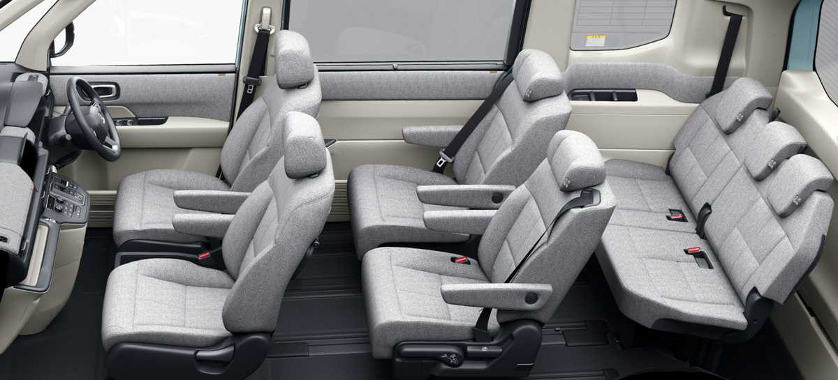 Салон новой гибридной Honda StepWGN рассчитан на 7 мест. Сиденья имеют удобные подголовники и регулировку положений. Первый и второй ряд содержат по 2 сиденья. Третий ряд представлен диваном из 3 сидений, который способен складываться до ровного пола.