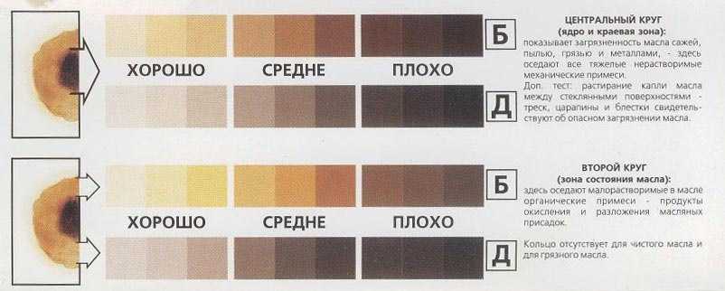 Светлый равномерный цвет диффузной области, ядра говорит о нормальной работе двигателя. Если моторная смазка накапливает механические примеси, то это проявляется потемнением ядра и зоны диффузии. На этом фоне внешнее более светлое кольцо все больше расширяется.