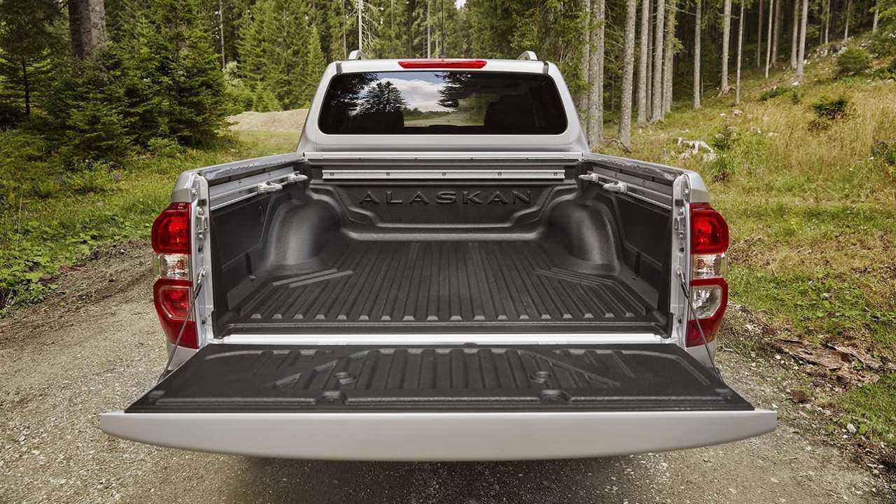 Грузовая платформа Рено Аласкан довольно вместительная, имеющая размеры: 1560 мм в длину и 1503 мм в ширину, на которой можно перевозить грузы весом до 1,1 тонны. Задний борт открывается вниз, что позволяет удобно грузить машину и перевозить на ней длинные предметы. На крыше пикапа имеются рейлинги, на которые крепится верхний багажник, где можно перевозить велосипеды, лыжи, сноуборды, а также устанавливать универсальный бокс для вещей.