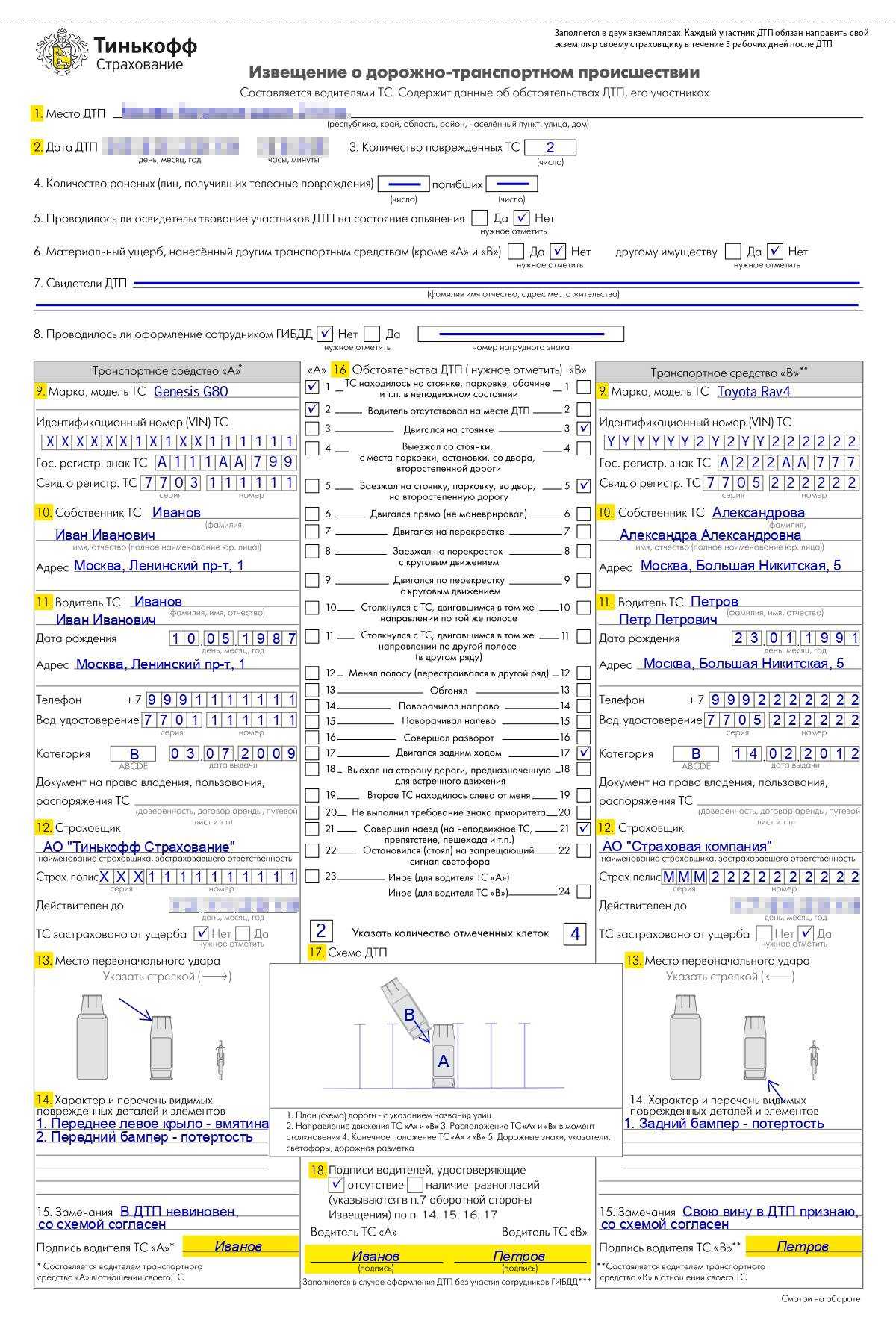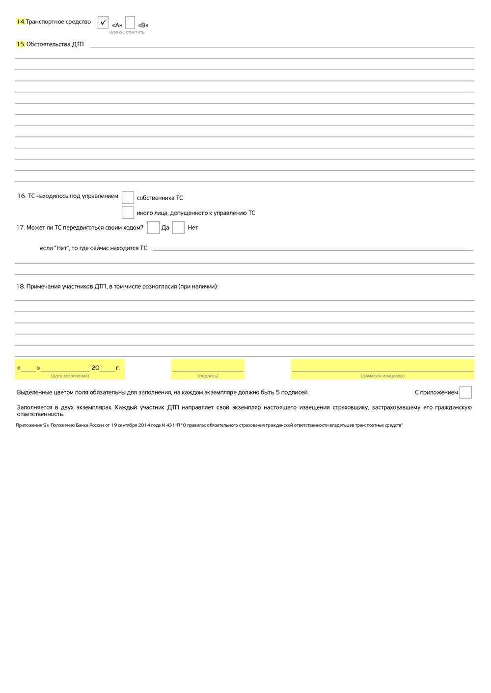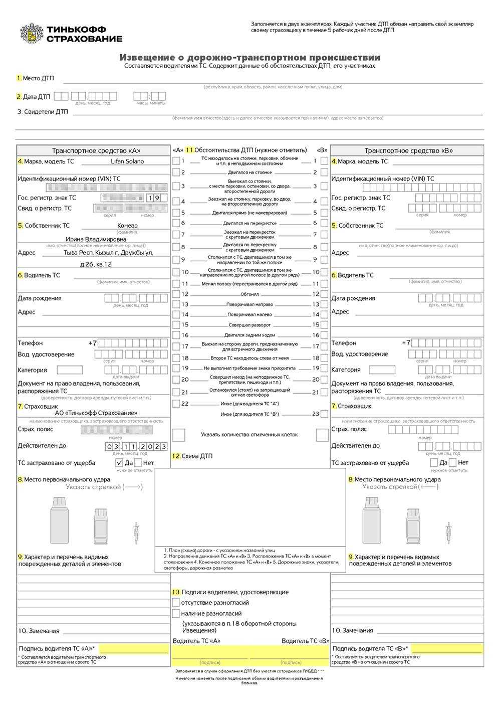 «Место ДТП» — город, улица, номер дома, возле которого произошло ДТП. Если вы на трассе и домов рядом нет, укажите километр шоссе и расположенные рядом объекты. Например: «35-й километр трассы Москва — Петушки, в 100 метрах от поворота на Урюпинск». «Дата ДТП» — дата и время с точностью до минуты. «Свидетели ДТП». С 1 октября 2022 года графу можно не заполнять, в выплате возмещения не откажут. Но если очевидцы есть и готовы оставить свои данные, укажите их в этой графе. «Марка, модель ТС» — указывают марку и модель автомобиля или мотоцикла, VIN или номер кузова, госномер. Эти данные переписываются из свидетельства о регистрации ТС. «Собственник ТС» — указывают данные собственника, в том числе адрес его регистрации. Паспорт не нужен, все есть в СТС. «Водитель ТС» — данные человека, который находился за рулем автомобиля. Паспорт тоже не требуется, вся информация переписывается из водительского удостоверения. «Страховщик» — указывают название страховой компании так, как оно написано в полисе, номер полиса, срок окончания его действия. «Место первоначального удара» — стрелкой указывают ту часть автомобиля, куда пришелся первоначальный удар. Больше никаких записей в этом пункте не делают. «Характер и перечень повреждений» — чем конкретнее формулировки, тем лучше. Например, вместо «Помята боковая дверь» стоит написать: «Передняя левая дверь — вмятина в нижней части размером 50 × 10 см и глубиной 1 см». Площадь повреждений удобно мерить банковской картой: ее стандартный размер — 54 × 86 мм. «Замечания» — тут водители определяют, кто виноват, а кто нет. Именно по этому пункту страховые компании ориентируются, кто кому должен возместить ущерб. Водитель, считающий себя виновным, пишет: «Вину признаю, со схемой ДТП согласен». Пострадавший пишет: «В ДТП не виноват». Оба обязательно ставят подписи. «Обстоятельства ДТП» — каждый водитель ставит галочки напротив пунктов, которые соответствуют его действиям. В нижней ячейке укажите количество поставленных галочек — так никто не сможет дописать что-нибудь от себя. «Схема ДТП» — сделайте рисунок с указанием улиц и номеров домов, дорожными знаками, дорожной разметкой. Чем больше деталей на схеме, тем сложнее будет оспорить виновность в ДТП. «Подписи водителей» — каждый из участников ставит подпись и галочку, имеются ли разногласия по поводу произошедшего