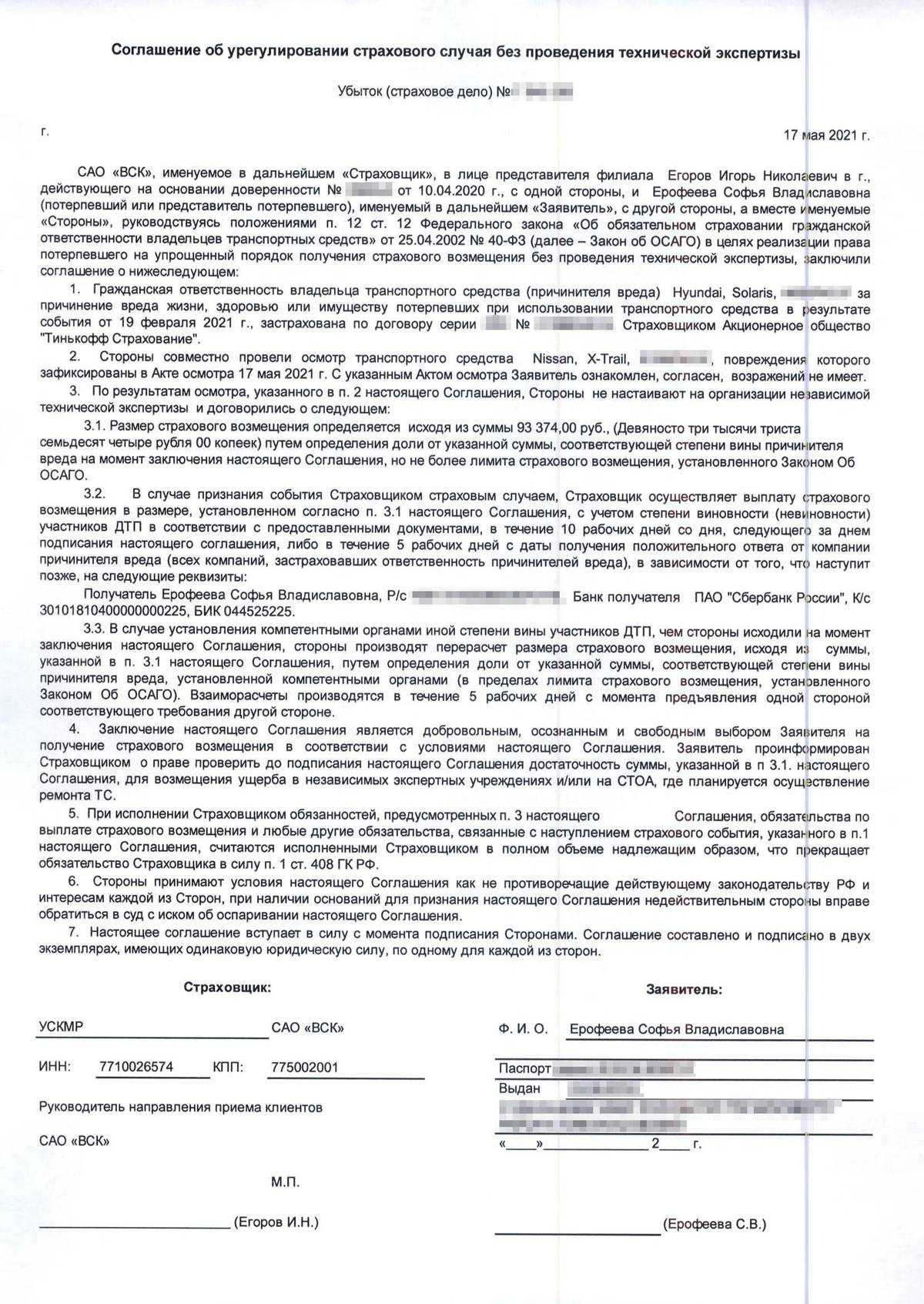Я спросила, как работники СТО собираются уложиться в 100 000 Р — это ограничение по бумажному европротоколу, — если независимая оценка насчитала за ремонт новыми запчастями 170 000 Р. Мне сразу же написали отказ в ремонте. На следующий день страховая выплатила мне 93 374 Р.