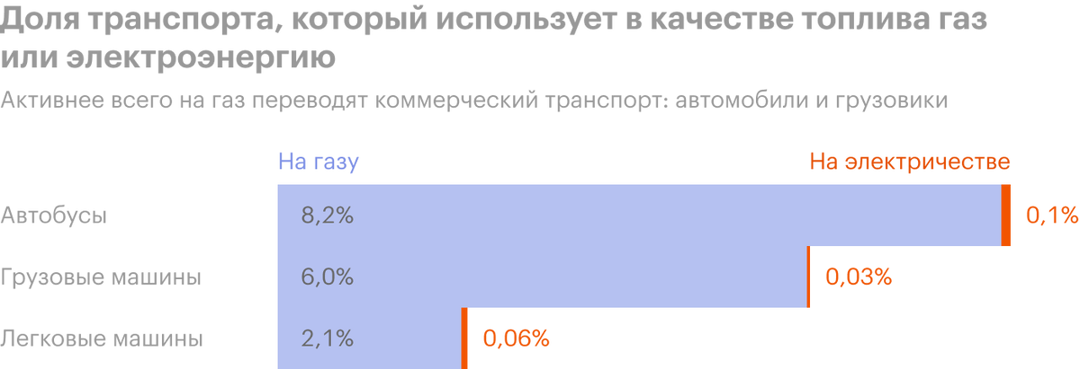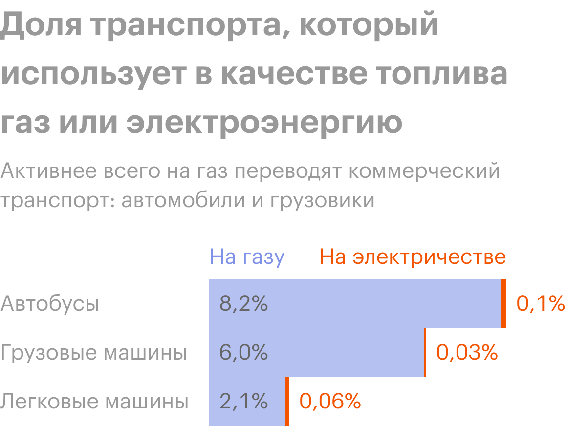 Россияне по-прежнему предпочитают покупать бензиновые и дизельные авто. В 2014 году правительство приняло , одним из пунктов которой был массовый перевод автомобилей на газомоторное топливо. Уже на следующий год Росстат начал собирать статистику о легковом транспорте, который использует такое топливо. За пять лет продвинулись несильно: в 2015 году на газе ездило 956,3 тысячи легковушек, в 2019 — 1,04 млн. Рост всего на 2,1%. Коммерческий транспорт переоборудуют более быстрыми темпами: «газовых» автобусов в стране уже 8,2%, грузовиков — 6%.