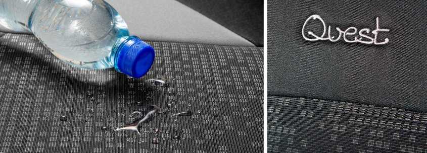 - Обивка сидений комбинированная ткань с водоотталкивающей пропиткой/экокожа с отстрочкой и логотипом Quest на передних сиденьях